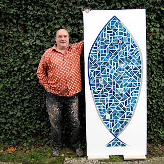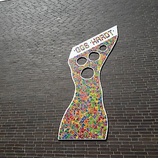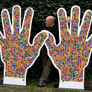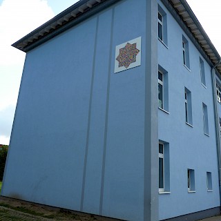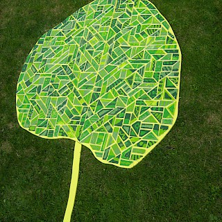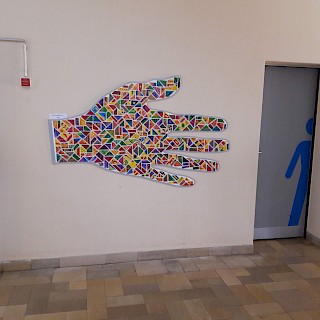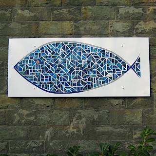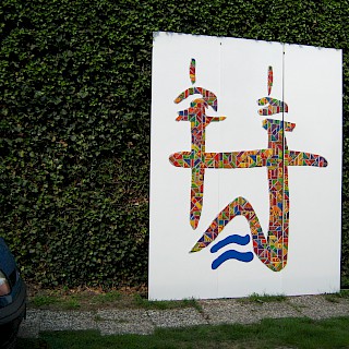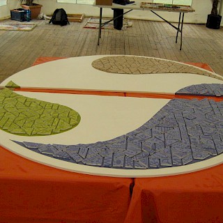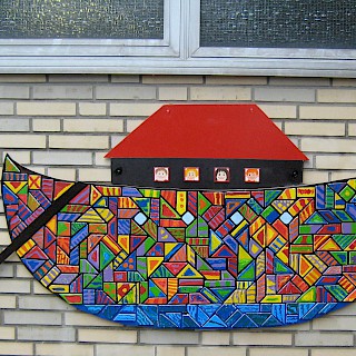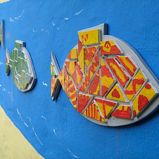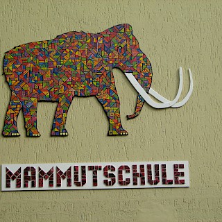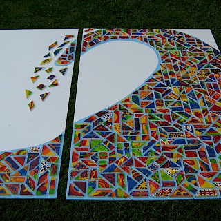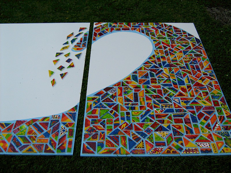 Aus Mosaikplättchen können auch Großmotive entstehen. Das Motiv kann dabei auf die Geschichte oder Besonderheit eines Ortes anspielen, einen Namen bildlich umsetzen oder ein bereits bestehendes Logo darstellen. Dabei können die Mosaikflächen aus den Plättchen, die in der Kreativ-Aktion bemalt wurden, auch mit handbemalten Elementen kombiniert werden.